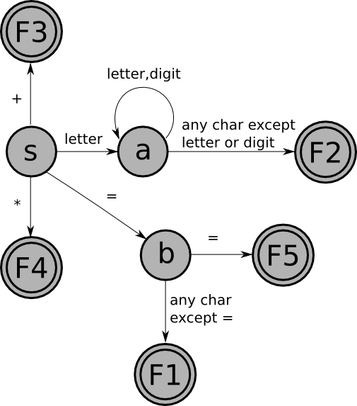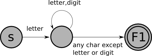 - Edges (arrows) are transitions. Each edge should be labeled with a single character. In this example, we've used a single edge labeled "letter" to stand for 52 edges labeled 'a', 'b', $\ldots$, 'z', 'A', $\ldots$, 'Z'. (Similarly, the label "letter,digit" stands for 62 edges labeled 'a',...'Z','0',...'9'.)